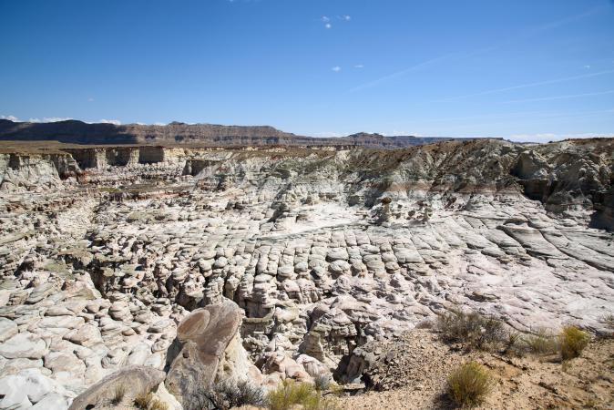 Saturday, September 16 : we go to the office to book an extra night but unfortunately, it's complete. Well yes, it's Saturday, we had not thought about that! We find ourselves as goodies! No choice, we dismantle the tents, we lose 1 hour. We refuel and drive to Churchwell to take a trail that leads to Sidestep and Colorful Canyon. But, in one place, we are blocked by a wash quite muddy and with a march to go down. We park before and we continue on foot. It is 10:00 am. The walk is done in sand (still him!) up and down. It's exhausting. Sidestep is huge, bizarre shapes as far as the eye can see, impressive, especially this view :
