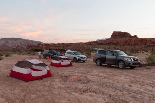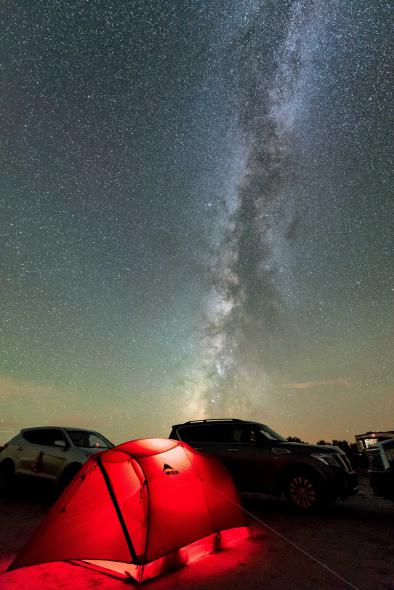 Back to the car at nightfall. We set up the tents while Janet and Graham prepare their pickup to sleep in it. We dine in the light of the headlamps.