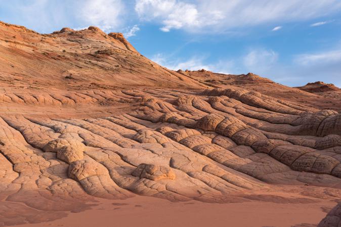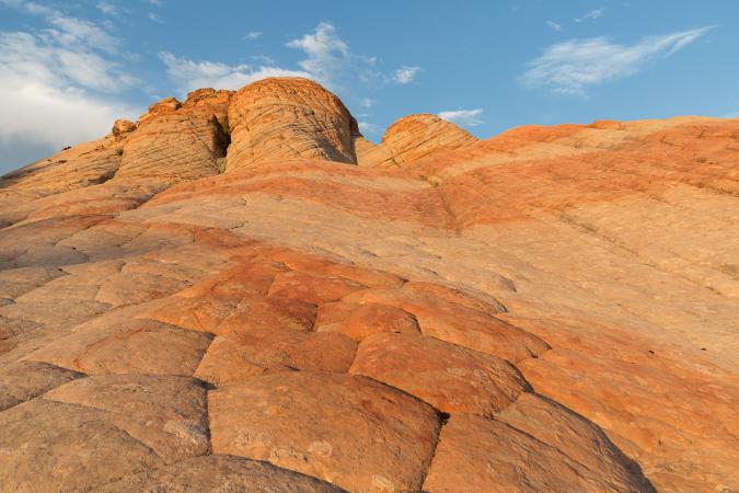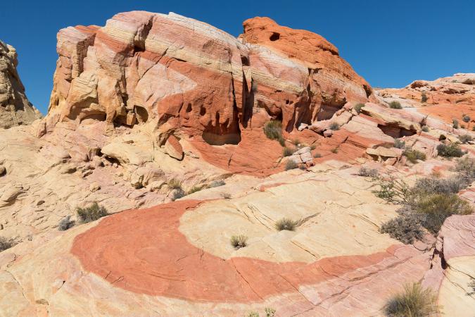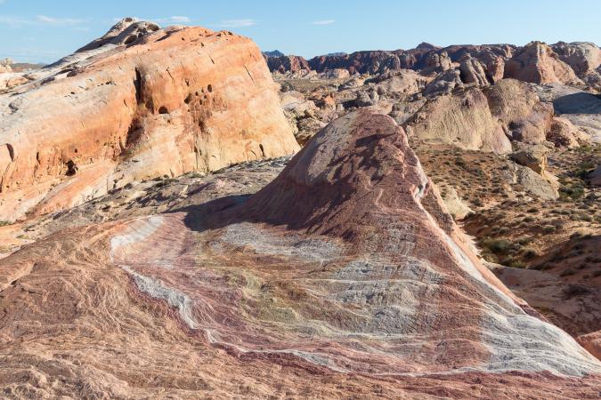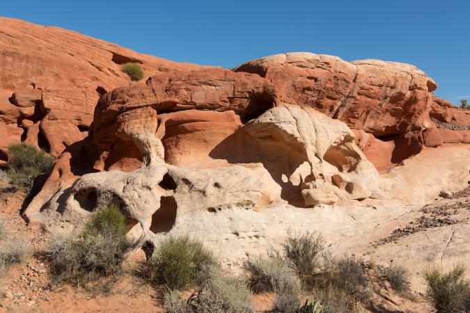 Around 3:30 pm, we take the Mouse's Tank Road and we park at the Fire Wave parking. We start the "7 wonders" hike. The loop is 2.9 miles and we discover, as the name suggests, 7 sights: Fire Cave, Thunderstorm Arch, Crazy Hill, Kaolin Wash, Striped Rock, Pink Canyon, Fire Wave. First of all, we see Fire Cave, a kind of cave with arches, which is a bit like a skull,