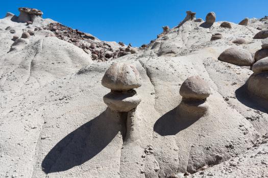 On the way back, hoodoos are photographed. We take our breakfast at 10:30 am and then dismantle the tents. The American friends return to Bloomfield and we 5, we leave at 11:00 am for another site in Bisti a little further on the parking lot: Eggs Garden, little eggs all round. They are funny.