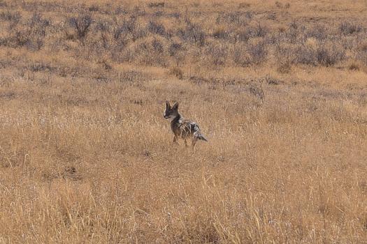 Despite its low clearence, Annick and Eric's car passes anyway. They return to Farmington. We check the track for Alien Throne. A coyote crosses the track in front of us, then stops in the meadow and looks at us. I take a picture before it leaves.