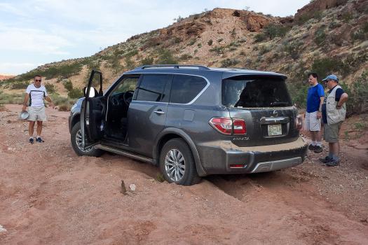 Sunday september 3 : we start the day by doing shopping which takes time. Around noon, we go to Glendale to find Annick, Eric, Etienne and Stéphane at the Arco gas station. It is already 102 ° F. At 2 pm, we go to Little Finland. The temperature rises to 106 ° F. We take the Mud Wash. It is not too bad; some delicate passages for Eric's car (Hyunday Santa Fe), which clearance is not very high. At times, our car reacts oddly on the sand. Arrived at the cattle pen, we decide to go to the 2nd car park to be at the foot of the "wall". Ouhh the bad idea ... our car skates and finally is stucked in sand. While Stéphane and Étienne went well with their Infinity. This is where we realize that we do not have a 4WD but only a 2WD. Given the size of the car, we thought it was a 4WD!