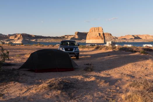 Arrived on Flagstaff, it drops a few drops of rain and it is only 59° F. As it is often the case when corssing this city, we stop at the "Peace Surplus Outdoors" store, which sells a lot of items for camping and outdoor activities. We leave at 1:20 pm and to please David who claims a baconator (bacon burger from Wendy's) since 2 hours, we stop eating one at Wendy's. We restart the belly filled at 2:15 pm. We arrive at Page and go directly to the Wahweap Campground. We are told that it is complete. The Navajo offers us to go to Lone Rock. We try and take a night at $ 14. Well, there is no definite location, no table and no fire. But there are dry toilets. We do not go too far either because the closer we get to Lake Powell, the more sand there is. It's pretty windy. It is painful to set up the tents and we have to take refuge in the car for dinner.