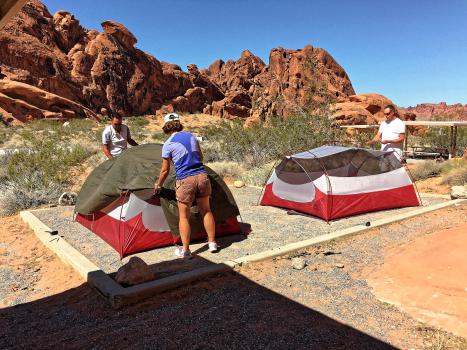 Wednesday september 27 : we have breakfast on the tables outside. Departure at 9:30 am for Valley of Fire (85 ° F). We arrive at 11:30 am (Nevada time). Still at 5, we take two locations side by side at Atlatl Rock Campground ($ 20 the park entrance + campsite). We nibble and set up the tents.