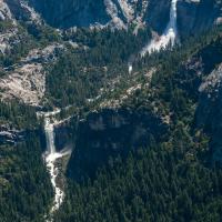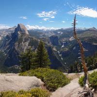 Pour faire cette randonnée de 14kms, il faut réserver le bus pour Glacier Point au Yosemite Lodge (25$ par personne en 2010). Cette balade permet d'avoir une vue d'ensemble sur le parc. Les vues sont superbes, la 1ère étant à View Point avec une vue sur Half Dome et sur Lower et Upper Yosemite Falls. La balade consiste ensuite à rejoindre Yosemite Valley. La grande partie du trajet se fait en descente parfois assez raide. Mais il y a aussi quelques remontées assez longues notamment après Ililouette Falls en allant vers Nevada Falls. L'arrivée à cette cascade se fait par le haut. Elle est très impressionnante par le débit et le grondement de l'eau qui se jette dans le vide. On se dirige ensuite vers Vernal Falls. Le moins que l'on puisse dire c'est que ça descend raide sur les roches. Attention aux genoux !! En passant près de Vernal, on se fait littéralement rincer car le sentier (qui peut être glissant) passe très près de la chute d'eau. La fin de la randonnée se fait à l'arrêt n°16 du shuttle.